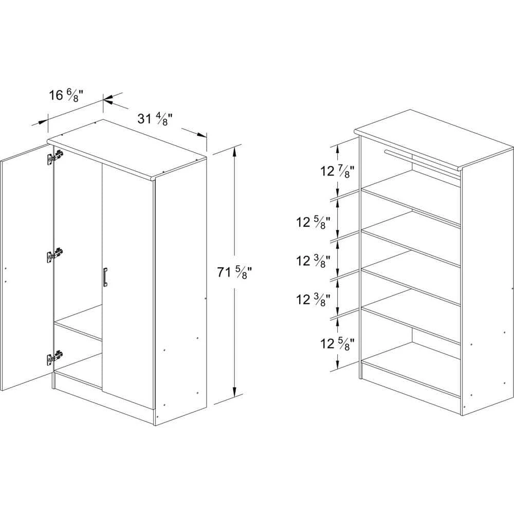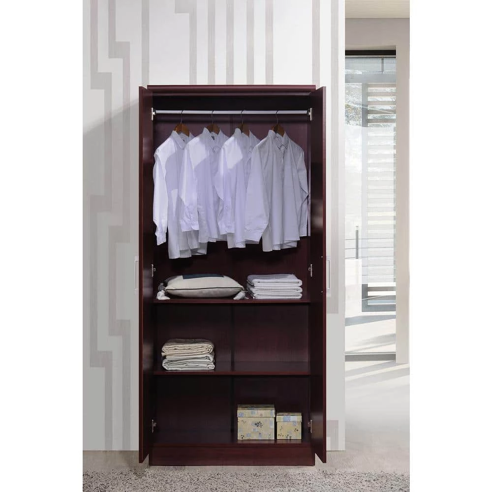 The Hodedah 2-Door Armoire is constructed of sturdy, durable, top quality wood. Features a laminated finish in a variety of colors. It has two doors that easily open to a spacious wardrobe. Behind the two doors, there are four shelves that can be used to store clothing, bed sheets, pillowcases, blankets, towels, books, papers, magazines and so much more. The inclusive garment rod allows you to neatly hang your clothes up if you prefer. You can place this armoire in your living room, guest room, kids’ room, bedroom or den.