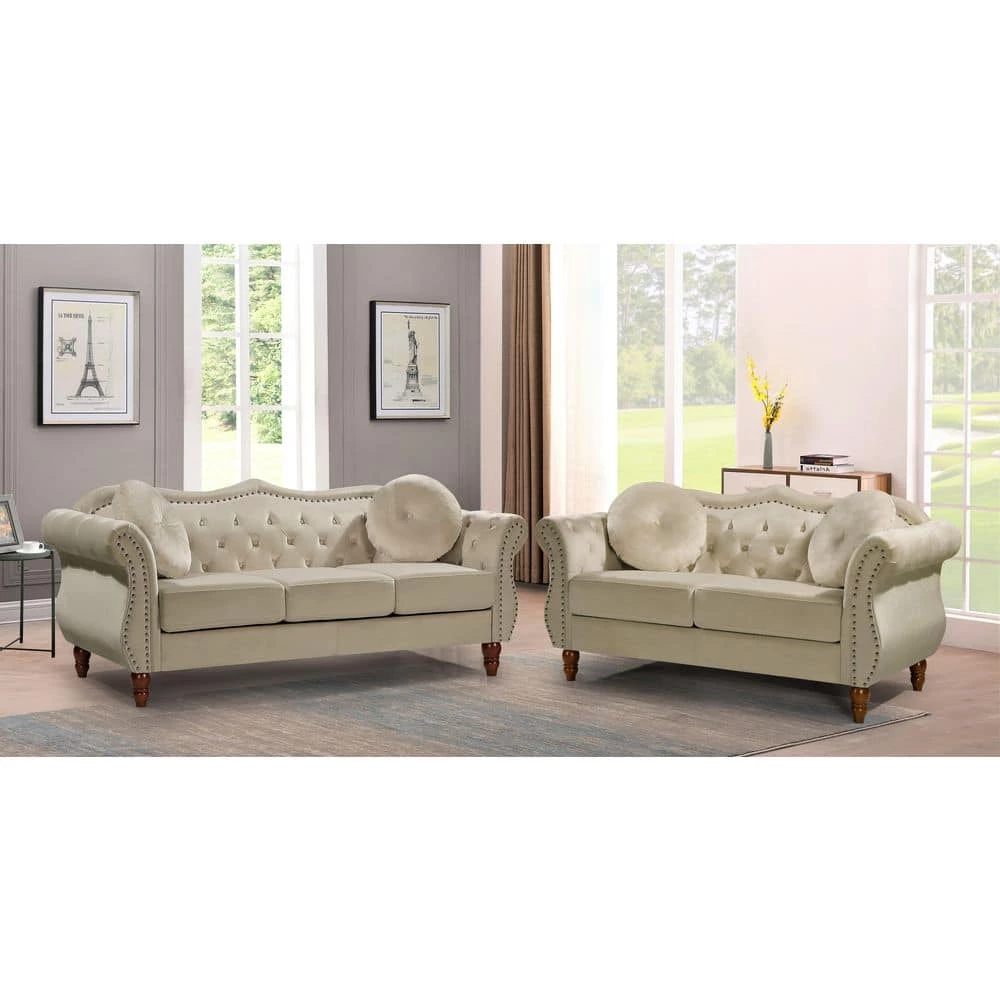 The perfect piece to reflect your regal tastes, this classic nailhead chesterfield sofa anchors your seating ensemble in timeless appeal. Crafted from wood frame, this dapper design strikes an updated, clean-lined silhouette with tight Pleated Rolled arms and wood round tapered feet. Crushed velvet upholstery brings out this sofa’s glamourous side, while exquisite details including high-density foam fill with spring support, piped seat cushions, matching bolster pillows, and a button-tufted backrest elevate the design. With Coordinating Throw Pillows.