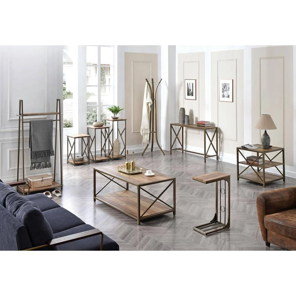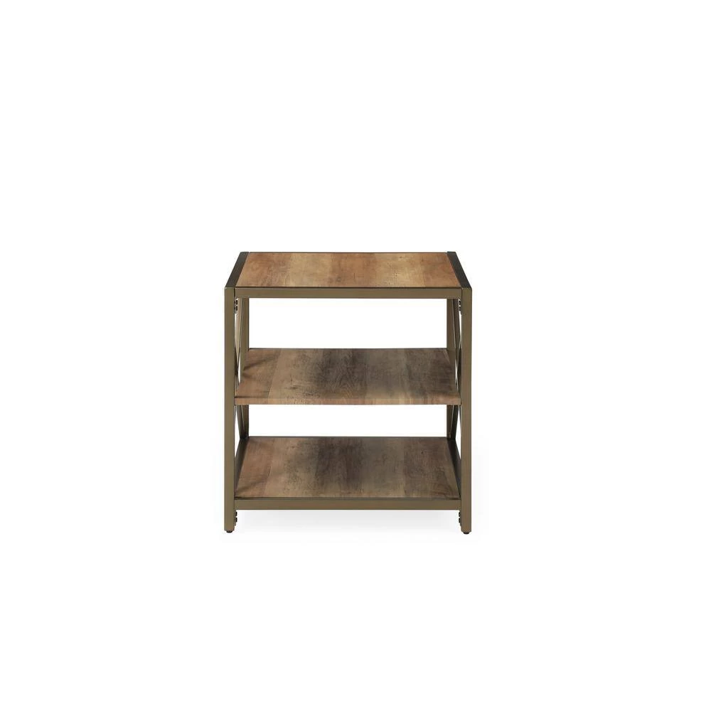 Simple yet versatile, the Hodedah End Table was designed to be aesthetically pleasing where ever you place it. Constructed from metal and manufactured wood it is sure to last for years to come. Its brushed bronze finish creates a rustic ambience in your home and its cross side detail exudes a farmhouse feel. Its open base keeps your space airy and also allows for extra storage for books and magazines. Sit back and rest your drink on this versatile table while you kick up and enjoy a movie, the uses are endless.