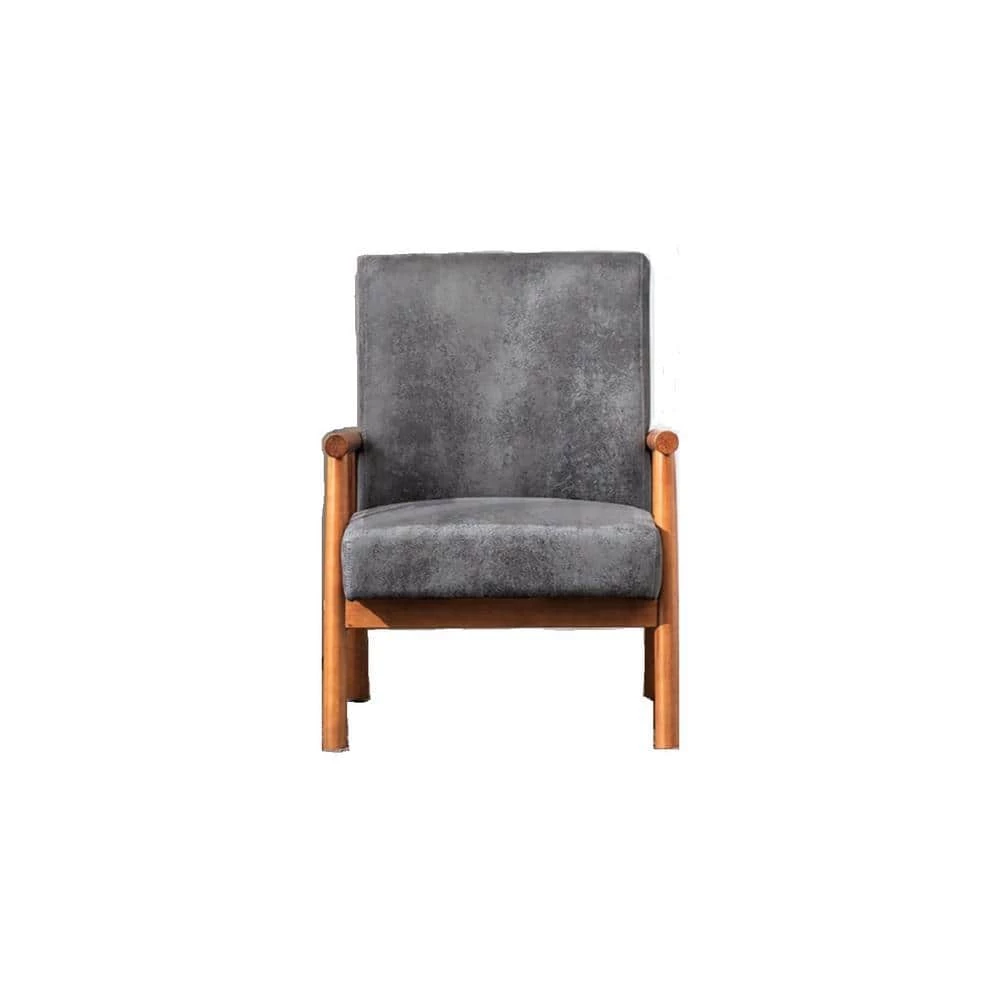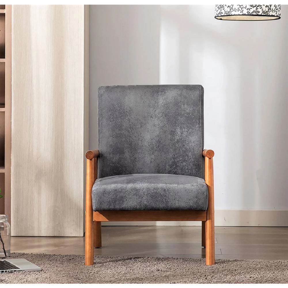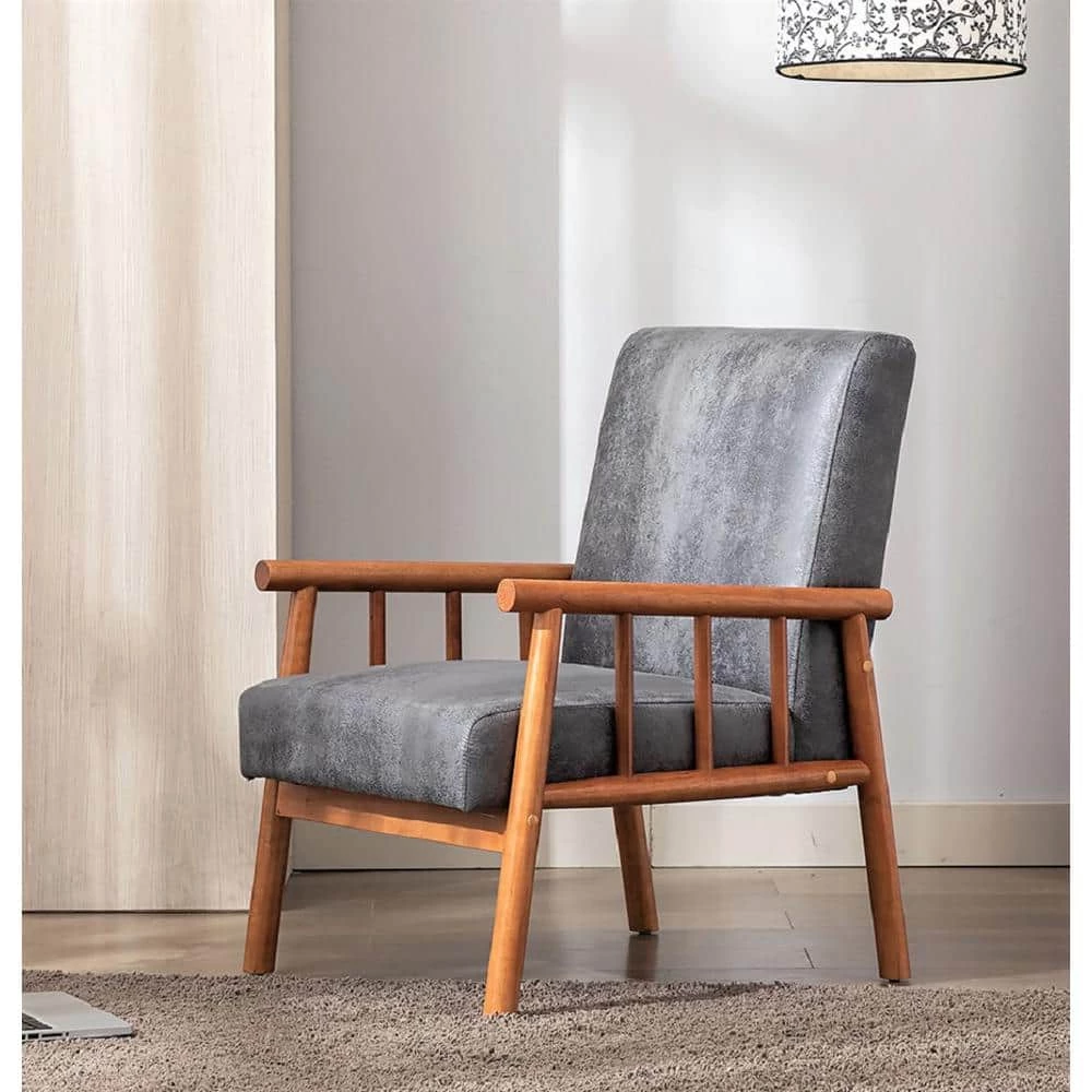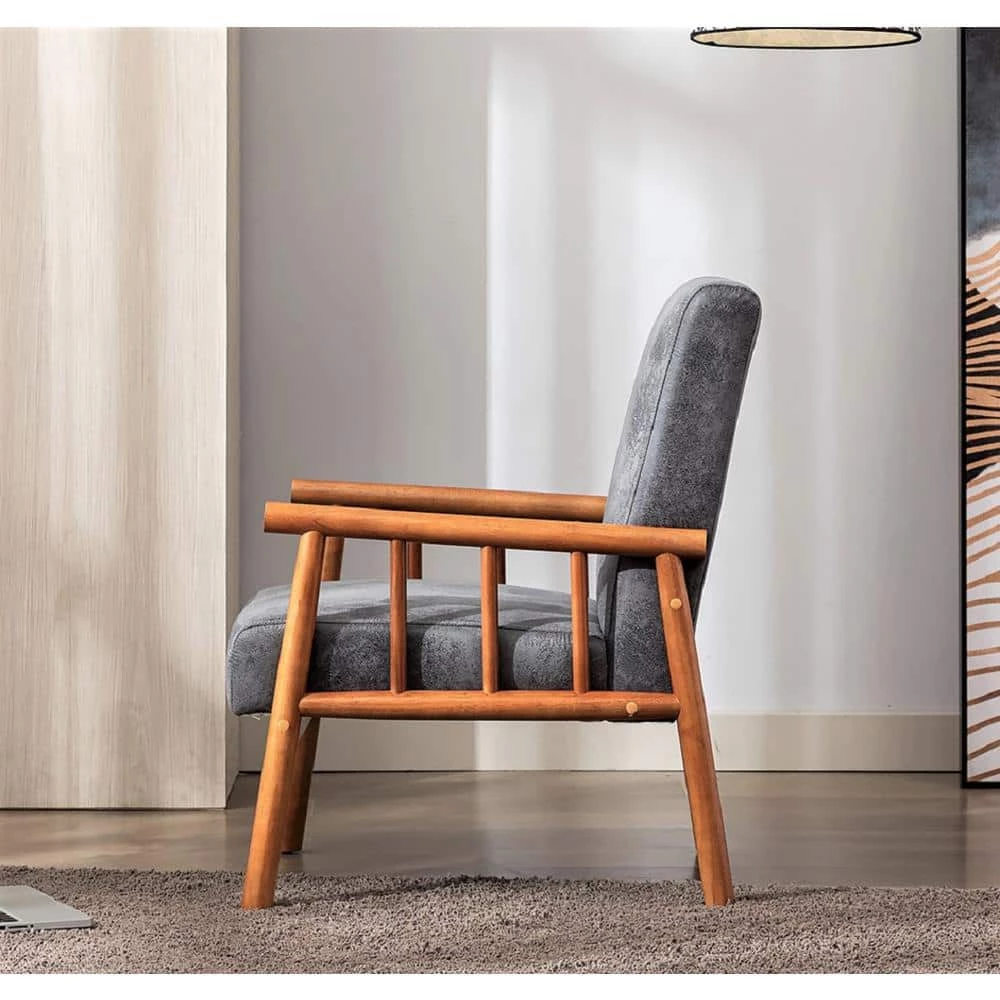 The Classic Mid-Century Modern Accent Chair, Perfect Vintage -Look Piece to Complete Your Mid-Century Modern Decor. The frame of This Piece is Crafted From Solid Wood in a medium Espresso Finish. This Attractive Wood Framed Chair Has it All, Style, Comfort, and Durability. Created With Plush foam Cushioning that encourages you to settle in and relax, it features a unique Open-Framed Arm Design. Complete with Rounded Wooden Accent bolt Covers for an authentic retro Finish, Comfortably padded Seat and Back Cushions are Finished in Leather look Microfiber for an Elegant Finishing Touch.