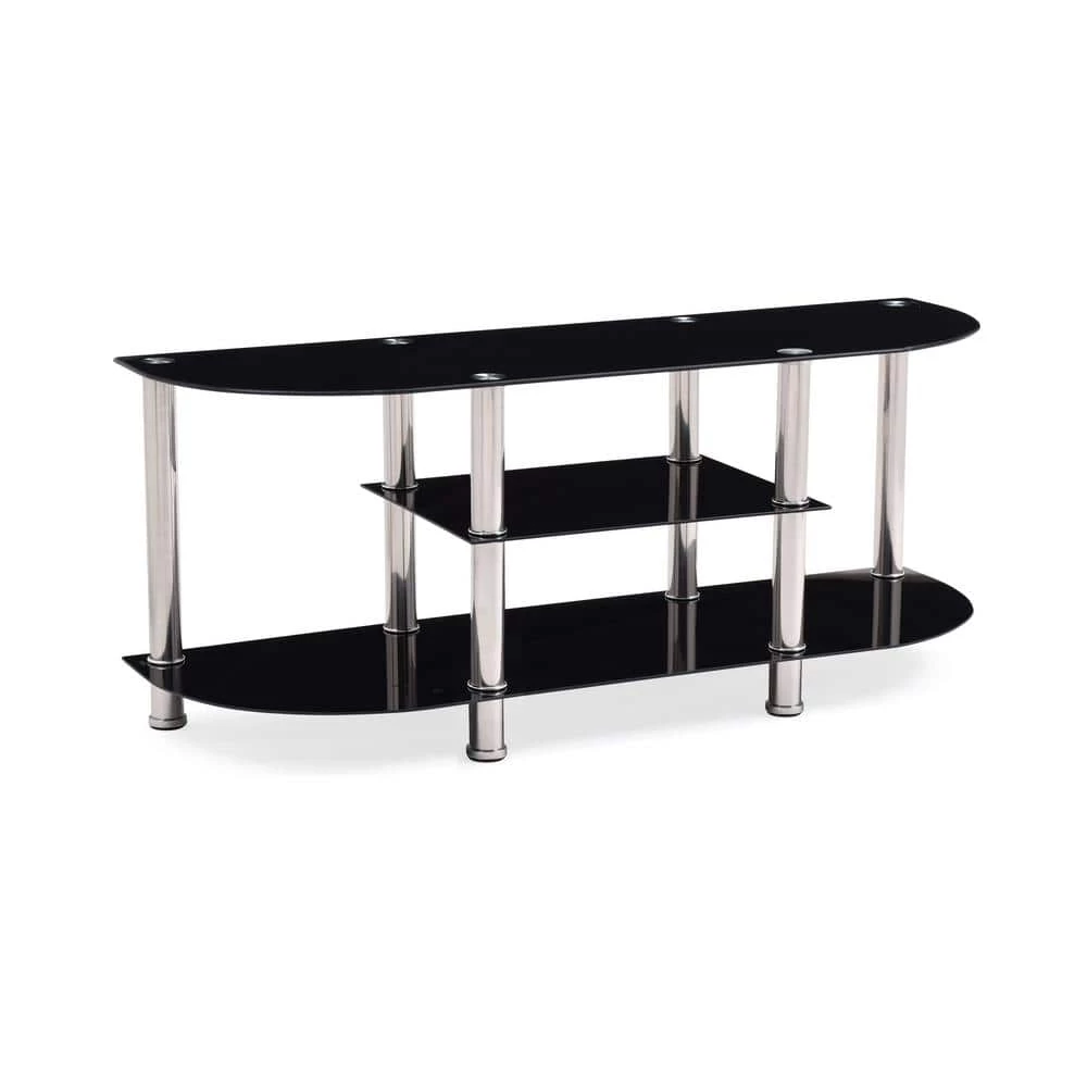 This Hodedah 55 in. Wide Tempered Glass TV Stand can accommodate most flat screen TVs up to 60 in. or up to 125 lbs. Two bottom shelves can be used to store game consoles, blue ray player and other media components. Made of elegant tinted tempered safety glass shelves and metal frame, this contemporary TV stand complements any room decor. Easy to assemble, includes an owner’s manual and easy-to-follow instructions. Attractive chrome cylinders support the shelves. Open architecture design provides plenty of air circulation for electronic devices. It can be easily be cleaned with glass cleaner.