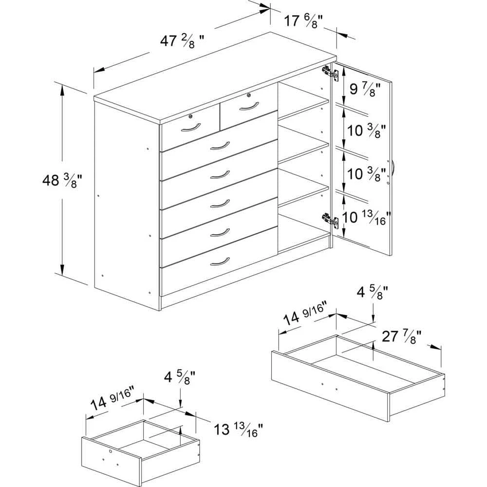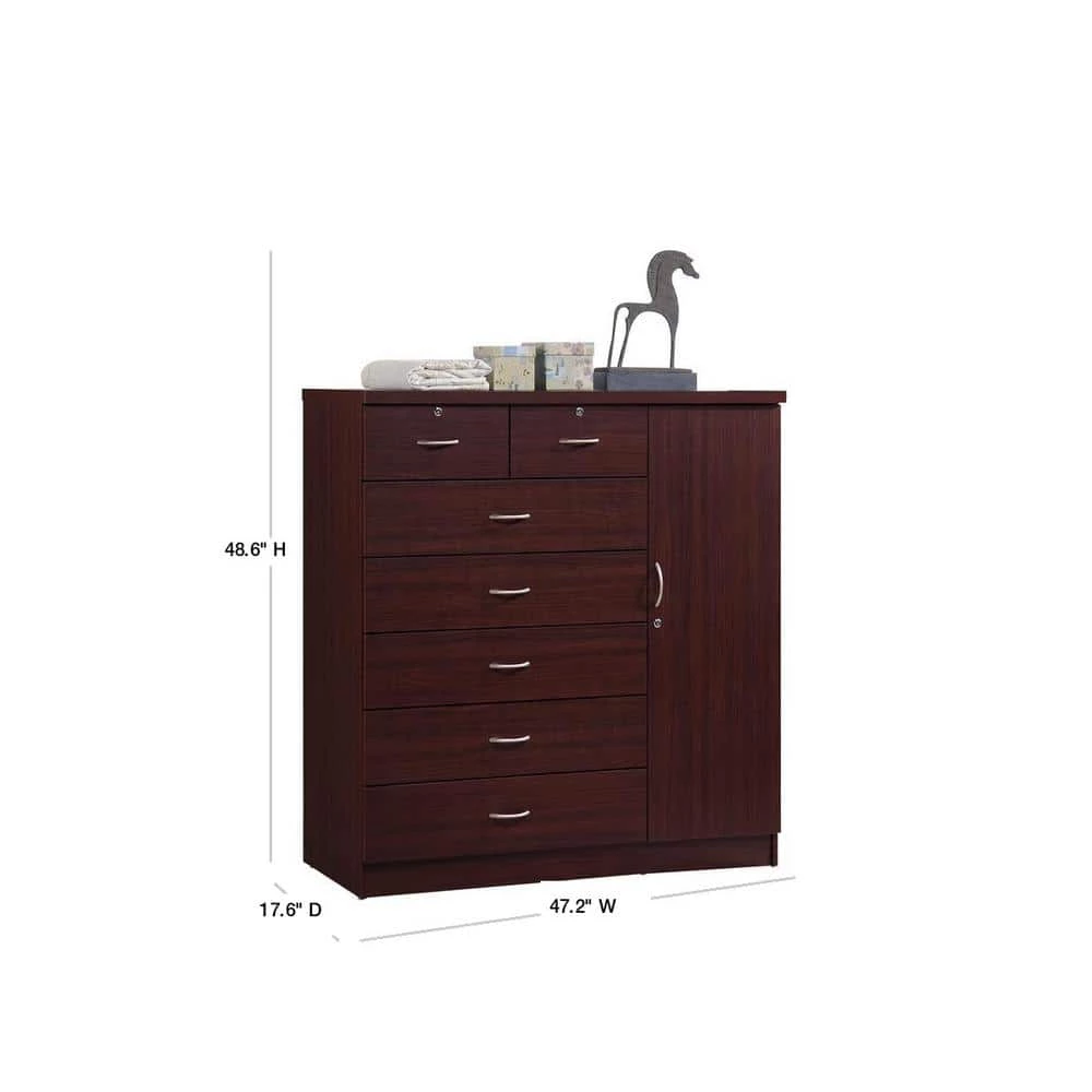 The Hodedah Seven Drawer Chest strikes a perfect balance between your storage as well as design requirements. It is constructed out of wood and is available in multiple finishes to choose from. This chest has seven drawers out of which two have locks and each drawer comes with extra support, which can handle extra weight. There is also a door when open reveals shelves and hanging rod for extra storage space. This chest has ample space on the surface top to showcase a photo frame, an antique clock, and a vase. This chest fits perfectly into any home decor. The Seven Drawer Chest by Hodedah has a clean and simple design making it easier for you to place it anywhere.