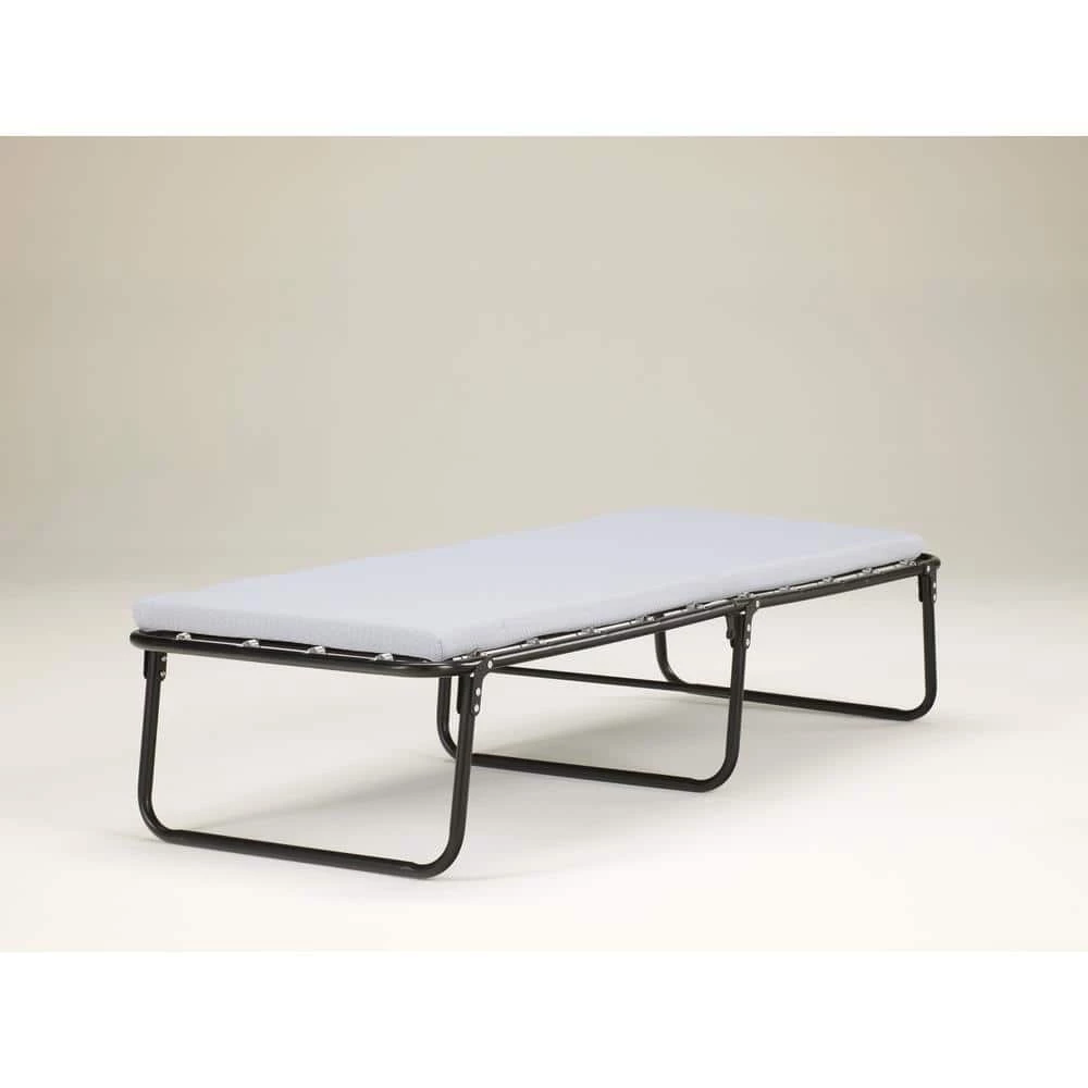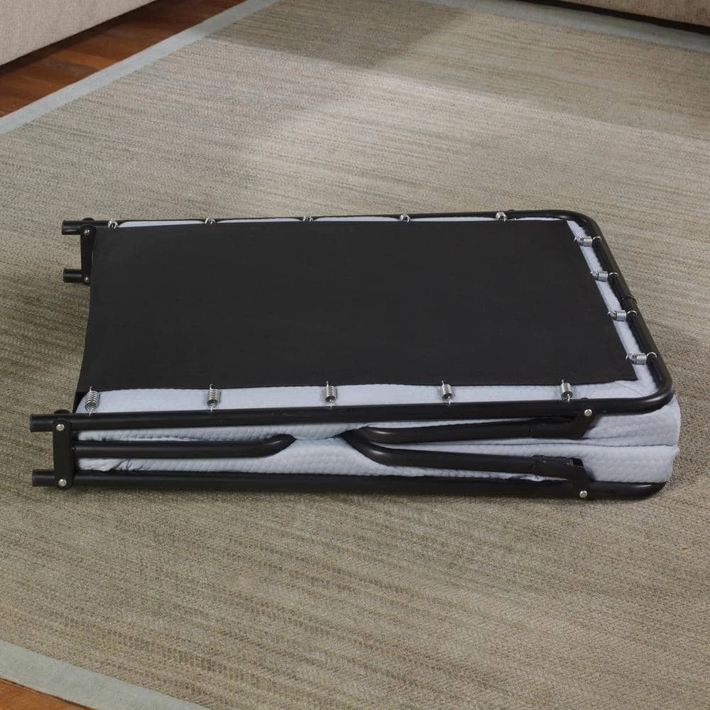 Simmons BeautySleep Foldaway Single Guest Bed is perfect for guest rooms, dorms, vacation homes, camping, or anywhere you need a bed with limited space. The reinforced tubular steel frame with center support bracing insures stability and supports for up to 250 lbs. Perimeter spring suspension provides a firm yet contouring sleep surface that won’t sag. Premium Micro-quilt 3-D Stretch Knit mattress cover is removeable and washable. 2 in. think memory comfort foam ensures you will enjoy a supportive, comfortable night’s sleep. Folds to only 5-1/2 in. thick for easy, unobtrusive storage. Single Size: 26 in. W x 75 in. D x 16 in. H. 1-year manufacturer’s warranty.