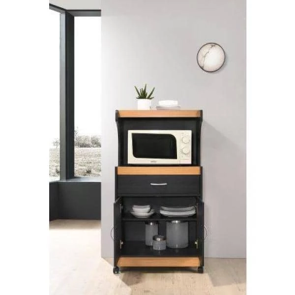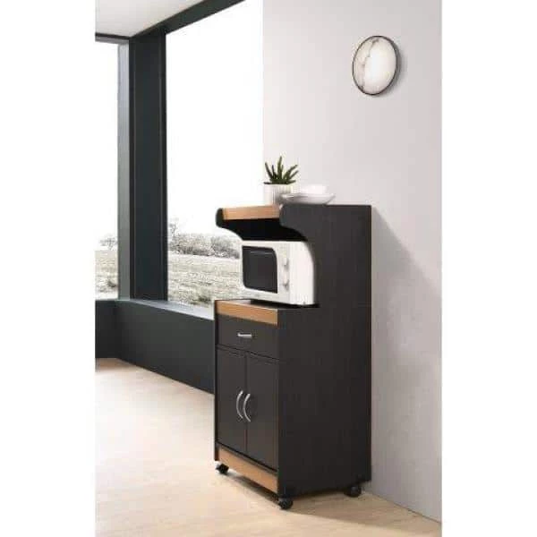 Contemporary and functional, this HODEDAH Microwave Cart is the perfect solution for your kitchen storage needs. The large open storage space at the center houses your microwave. The top shelf can be used to store your toaster oven. It has an enclosed cabinet space which provides compact kitchen storage for small kitchen appliances, pots and pans. It features a drawer for utensil storage. This microwave cart features wheels, which allows for easy mobility if necessary. It is made of wood, which ensures strength and durability.
