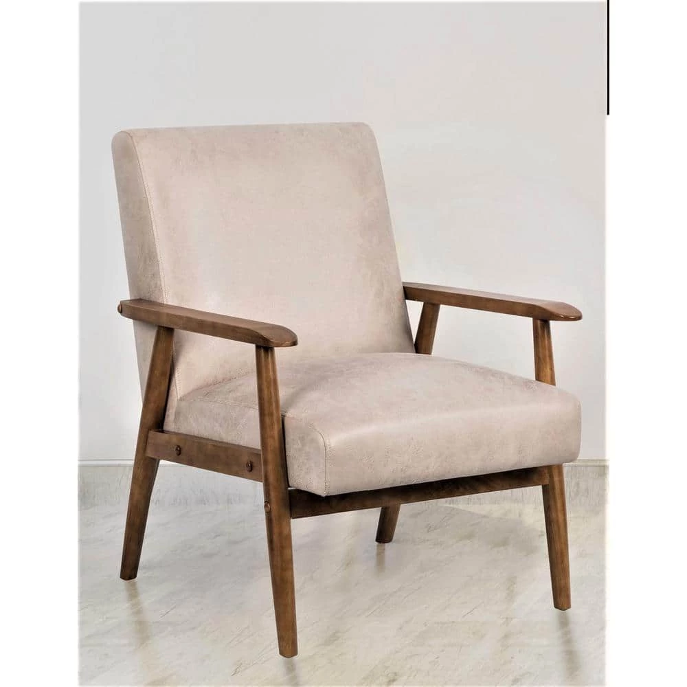 The classic mid-century modern chair, perfect vintage-look piece to complete your mid-century modern decor. The frame of this piece is crafted from solid wood in a medium espresso finish. This attractive wood framed chair has it all style, comfort and durability, created with plush foam cushioning that encourages you to settle in and relax. It features a unique open-framed arm design, complete with rounded wooden accent bolt covers for an authentic retro finish, comfortably padded seat and back cushions are finished in leather look microfiber for an elegant finishing touch.