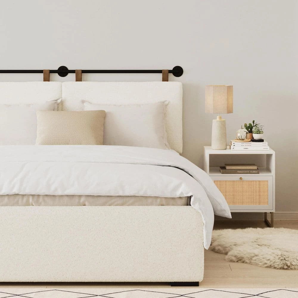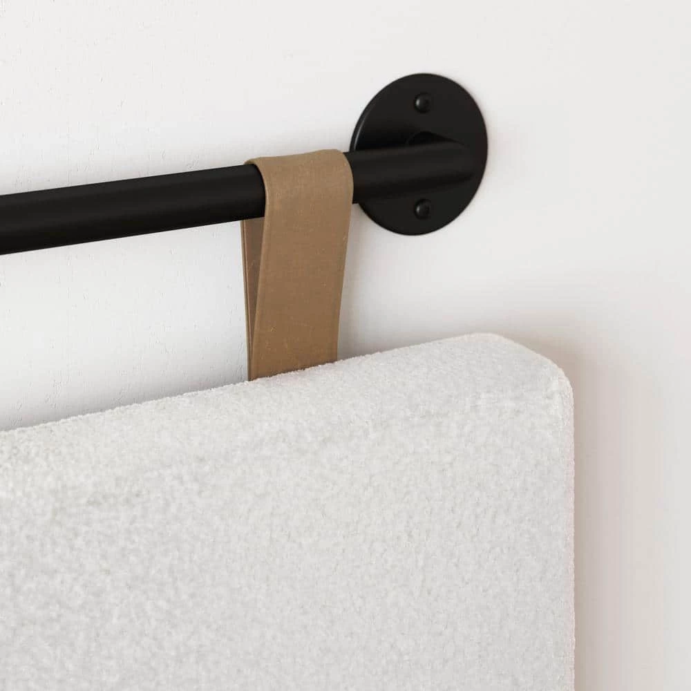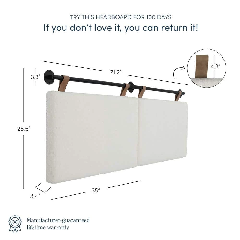 Charlie is a modern wall-mount padded headboard designed for king size beds. You’re not dreaming-you can elevate the look of your bed and add comfort in minutes as the elegant headboard is easy to install. Charlie features a textured boucle fabric hung by a sleek metal rail with adjustable brown leather straps to be hung at any height. The hanging fabric headboard can also add some softness and style to your seating area when used in an entry, dining, or banquette area behind a bench or a set of stools.Nathan James is the furniture company built for this generation. You don’t need to spend a fortune to get quality design-first furniture and when we say, “easy assembly”, we mean it. Our guarantee is our word. Your purchase is backed by a 100% money-back guarantee. If you have any quality issues just contact us and we will send you a replacement immediately-no questions asked.