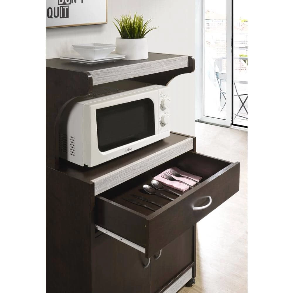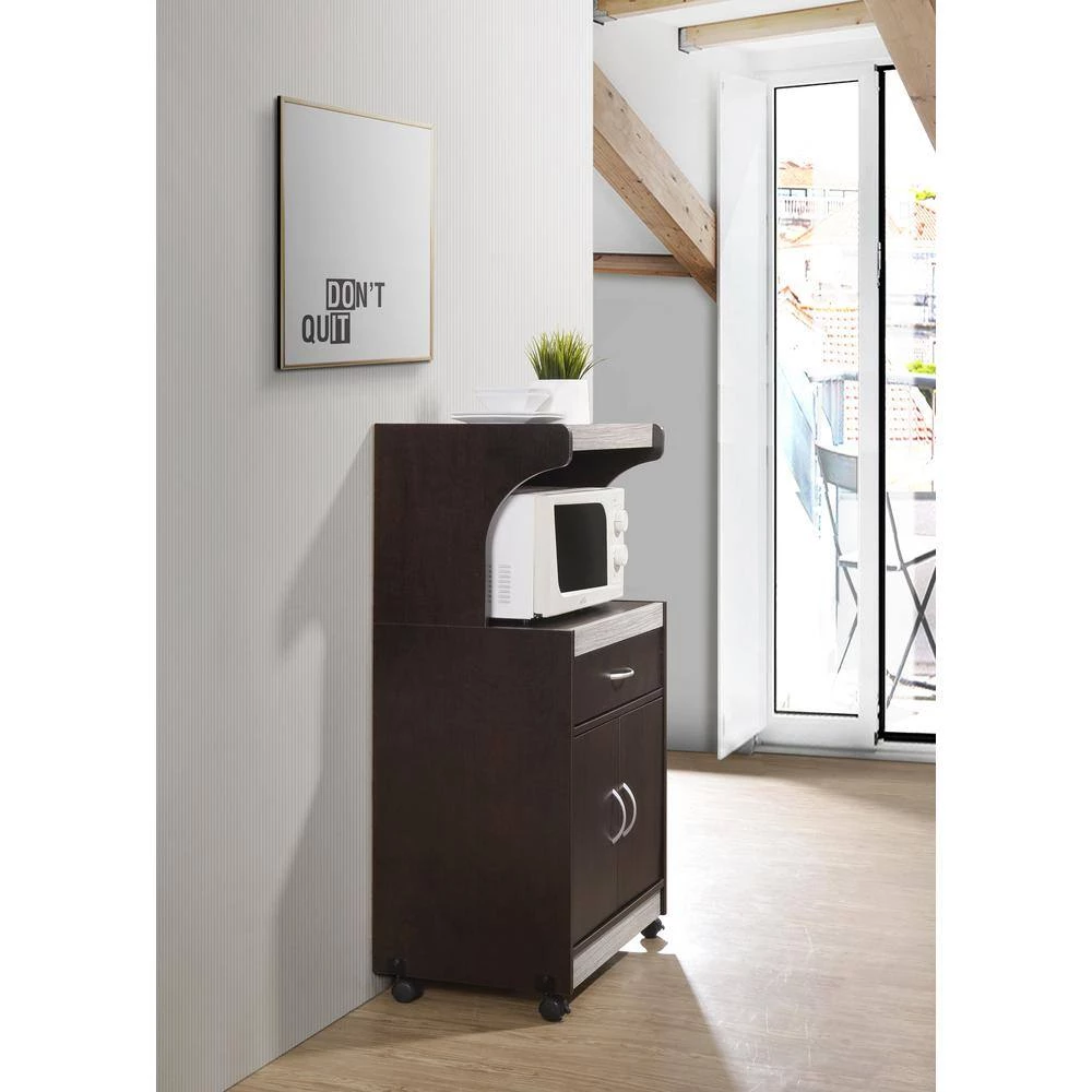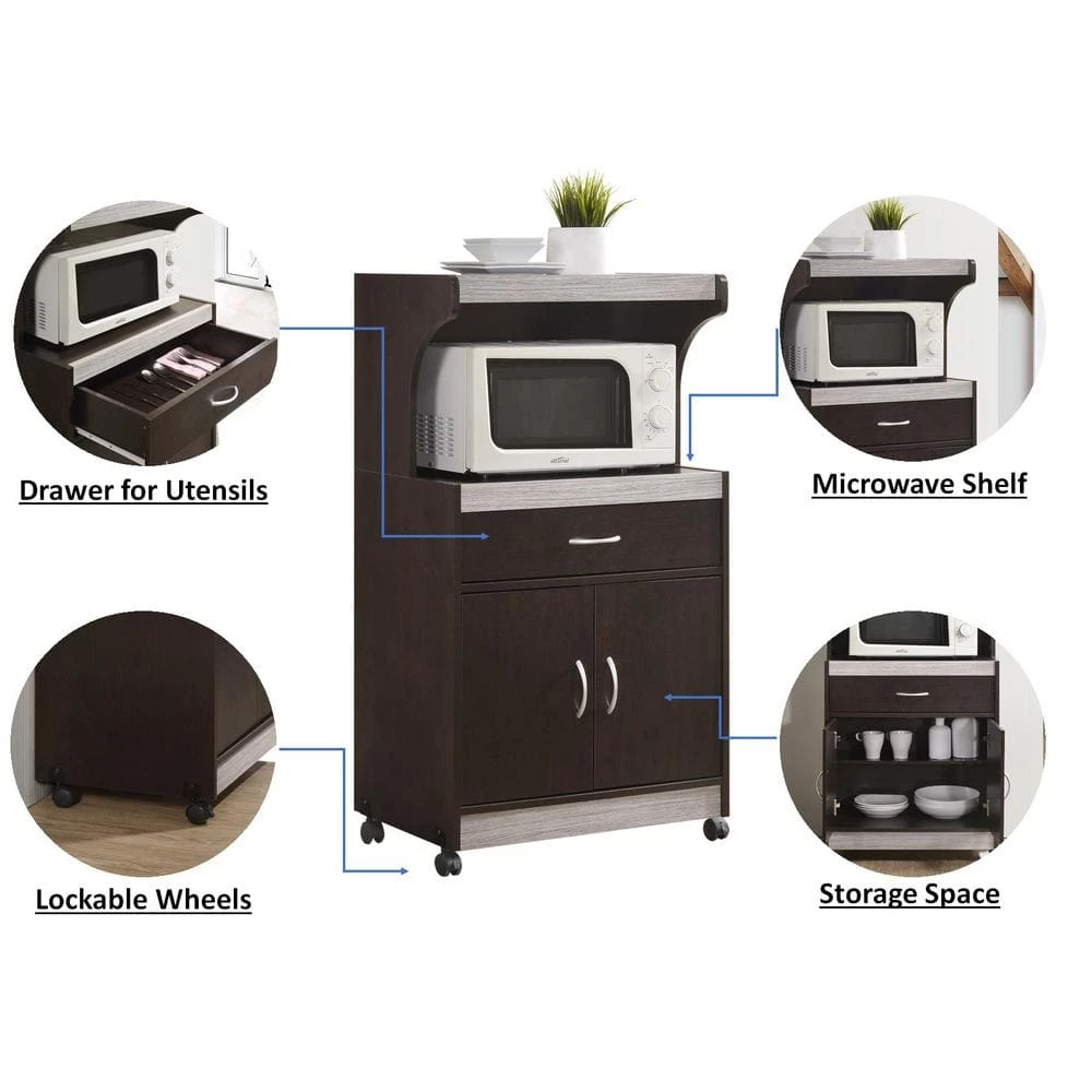 Contemporary and functional, this HODEDAH Microwave Cart is the perfect solution for your kitchen storage needs. The large open storage space at the center houses your microwave. The top shelf can be used to store your toaster oven. It has an enclosed cabinet space which provides compact kitchen storage for small kitchen appliances, pots and pans. It features a drawer for utensil storage. This microwave cart features wheels, which allows for easy mobility if necessary. It is made of wood, which ensures strength and durability.