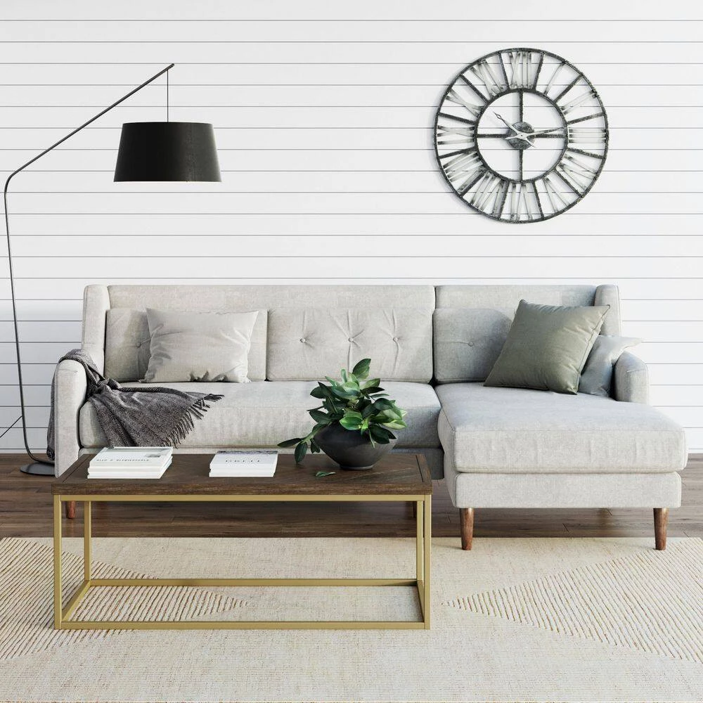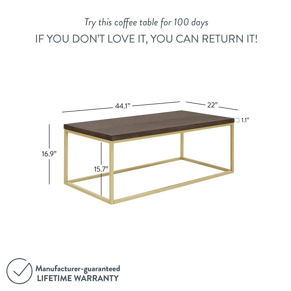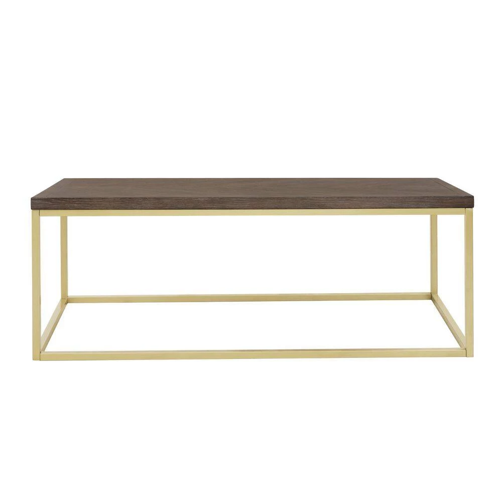 - Doxa has a durable gold metal frame topped with a thick piece of hand-brushed acacia wood veneer that offers a sturdy base with clean lines for a modern farmhouse coffee table