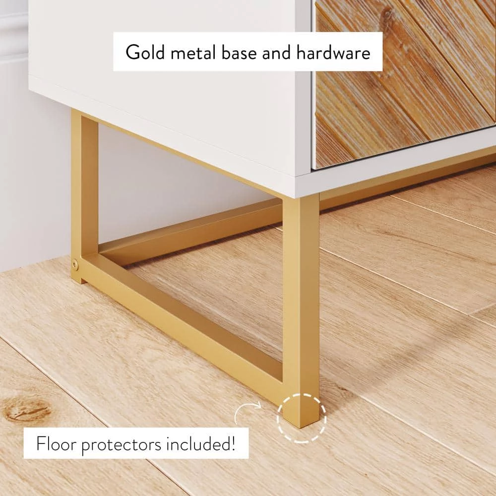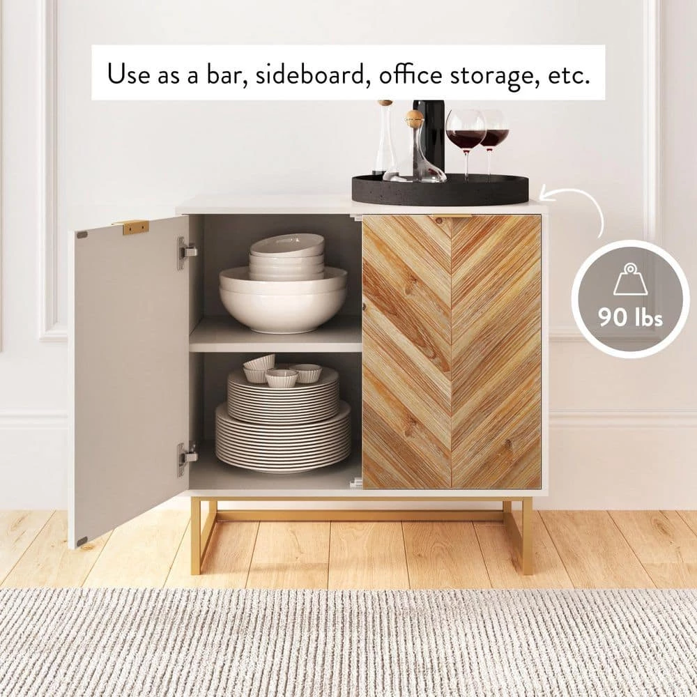 Enloe is a beautiful hideaway storage cabinet piece that demands attention with its rustic solid wood doors decorated in a sleek, elegant, herringbone design. Enloe has a clean white painted frame and brass powder-coated legs that have footpads attached to keep your floors from being scratched. With two swinging doors, this cabinet offers plenty of hidden storage and enough space to keep your home clutter-free, plus, you can adjust the shelves in the storage cabinet for the perfect amount of space.Nathan James is the furniture company built for this generation. You don’t need to spend a fortune to get quality design-first furniture and when we say easy assembly, we mean it. Our guarantee is our word. Your purchase is backed by a 100% money-back guarantee. If you have any quality issues just contact us and we will send you a replacement immediately-no questions asked.