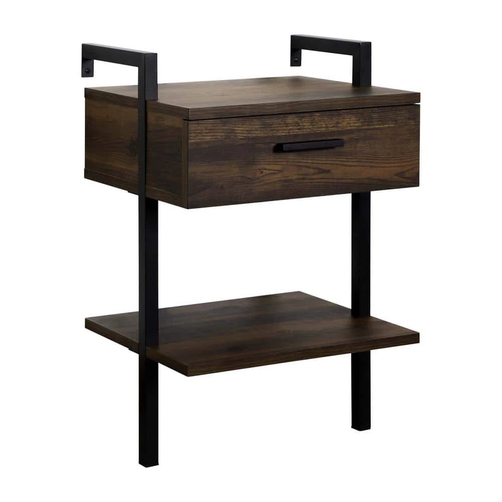 This rustic night side table is the perfect match for our famous Theo Bookcase! Jenny has a durable metal frame that attaches to the wall and is crafted from engineered wood in a nutmeg finish. The 27 in. tall wooden storage nightstand features a spacious drawer which is the perfect space-saving piece to have next to your bed or as a reading nook side table. This wall-mount bedside table is an instant sensation that makes a design statement and provides a storage solution.Nathan James is the furniture company built for this generation. You don’t need to spend a fortune to get quality design-first furniture and when we say easy assembly, we mean it.Our guarantee is our word. Your purchase is backed by a 100% money-back guarantee. If you have any quality issues just contact us and we will send you a replacement immediately, no questions asked.Materials:-Black Matte PC Metal Frame-Nutmeg Wood FinishAssembly Must-Haves:-Phillips head screwdriver (not included)-Drill with 1/4 in. and/or 5/16 in. drill bits-Packaging carton as a working surfaceWeight Limit:-90 lbs. tabletop-11 lbs. drawer-24 lbs. lower shelf.
