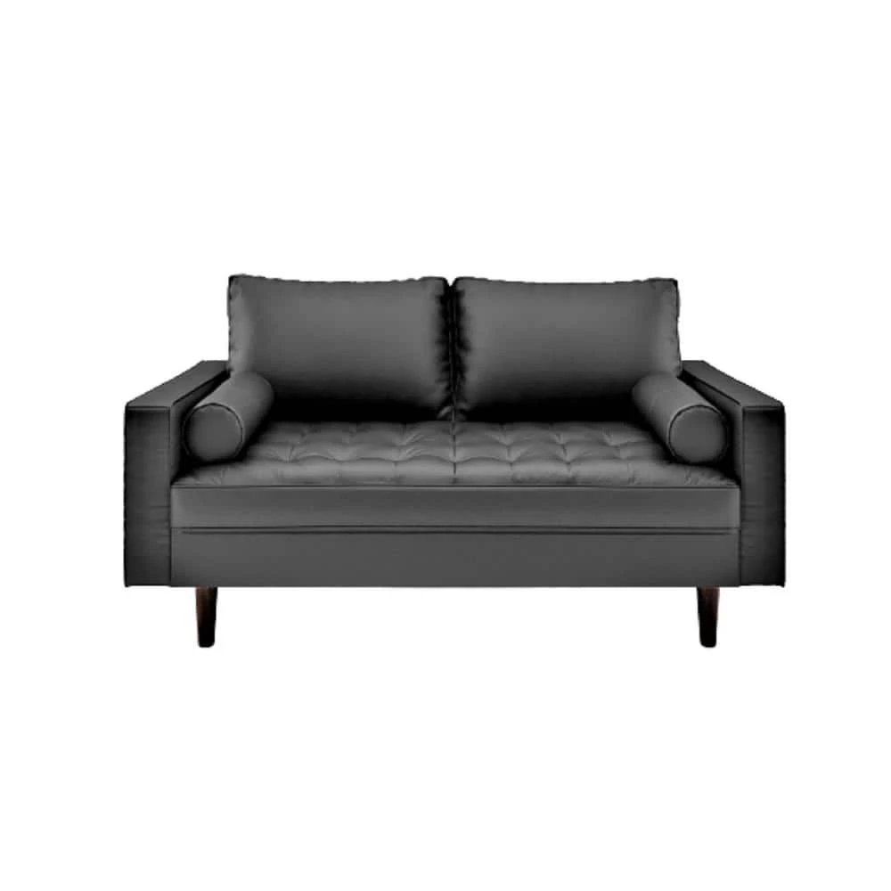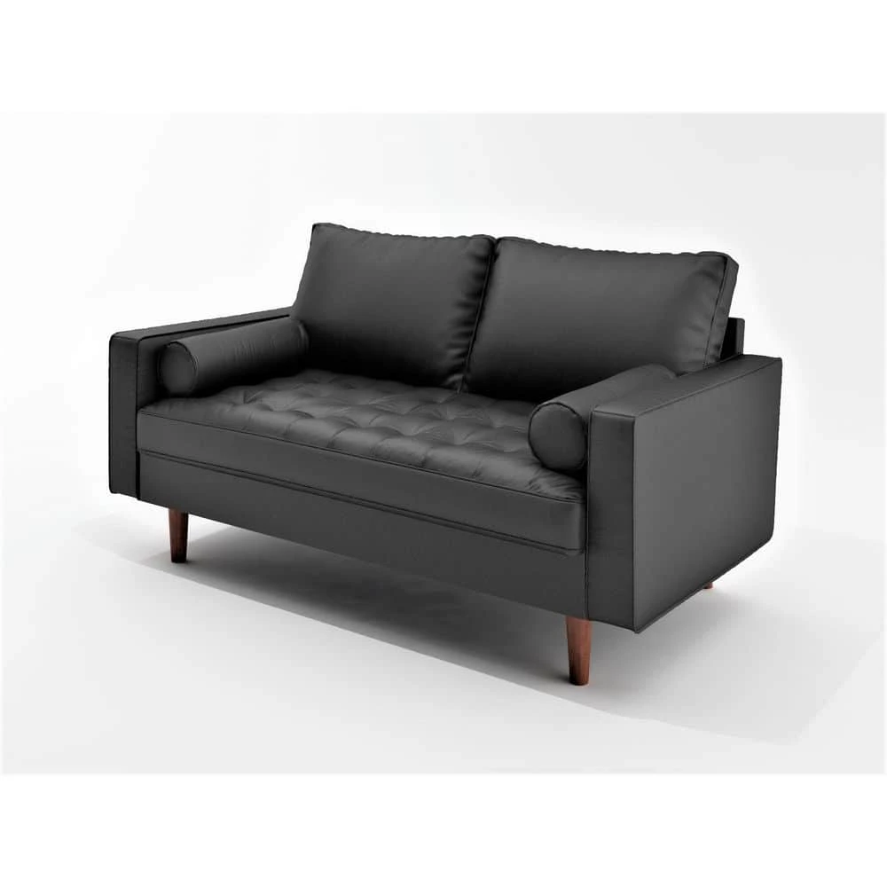 The classic design of the sofa, mid-century style gives this wood frame faux tufted sofa has a distinctive look that elevates your well-curated collection. It is button tufted details add a refined touch to any space while its streamlined silhouette and square arms fuse together to make a modern look. It features the button tufted seat and back cushion and finished wood legs. Two bolster pillows are included.