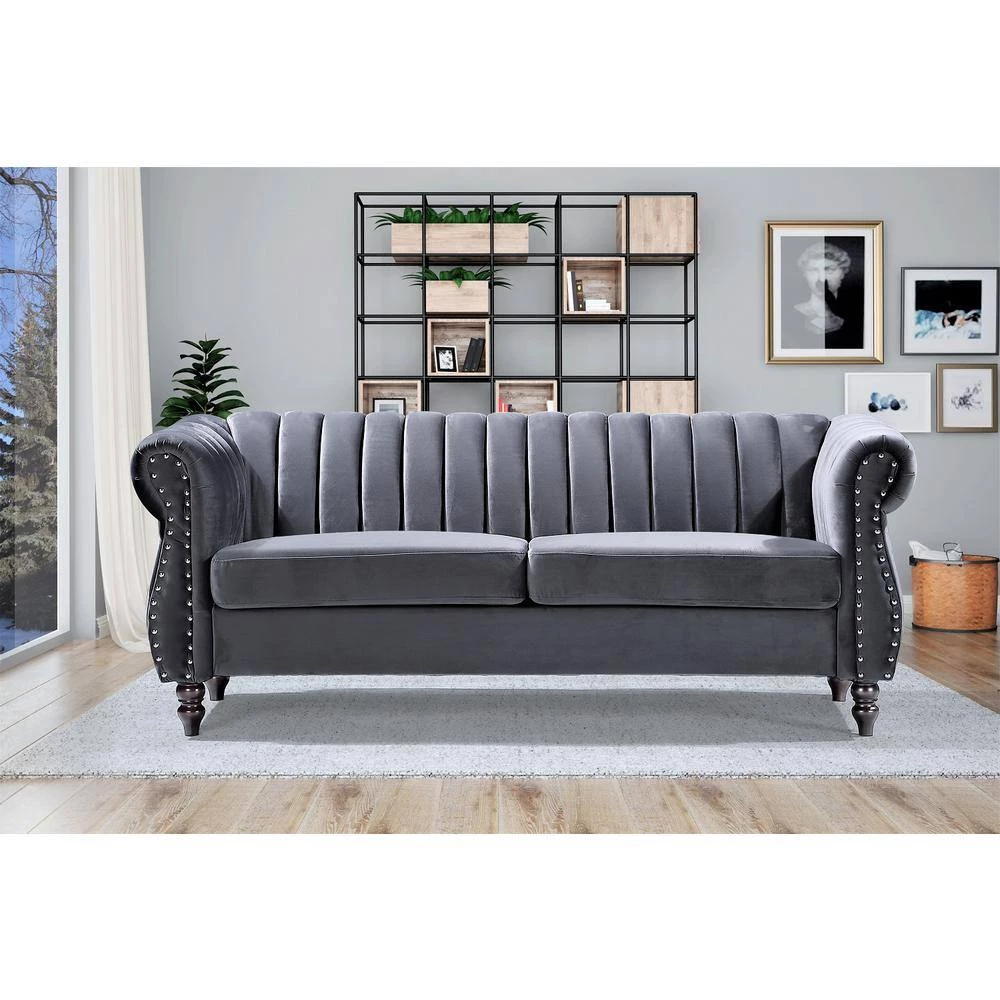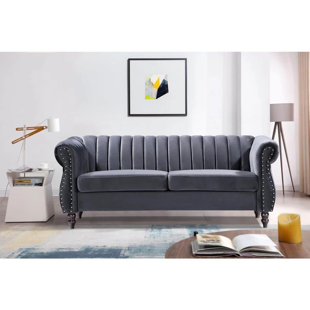 Beautifully styled and consciously crafted using materials, present your home in modern luxury with a centerpiece sofa that exudes a glamorous vibe at every angle. This chesterfield in. spired sofa is the ideal addition to any living room with its classic design and traditional elements such as scrolled arms, turned legs and nailhead accents. Upgraded with a sleek, modern touch of channel tufting, this sofa brings you an undeniably elegant touch to your interior space. Featuring soft velvet upholstery, this sofa stands as a streamlined statement piece that can change the whole flow of your living room. Velvet fabric upholstery imparts timeless style, while high-density foam creates luxuriously comfortable seating-complete your living room decor with these chic seating options.