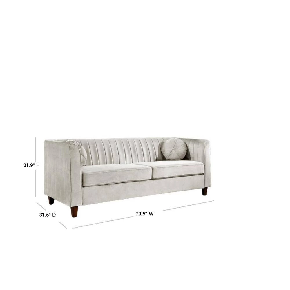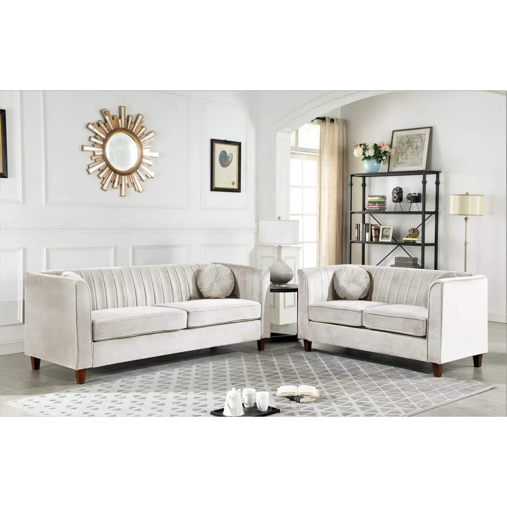 The perfect piece to reflect your regal tastes, this classic Kitts Classic Chesterfield Sofa anchors your seating ensemble in timeless appeal.Crafted from the wood frame, this dapper design strikes an updated, clean-lined silhouette with tight square arms and wood tapered feet.Crushed velvet upholstery brings out this sofas glamorous side, while exquisite details including high-density foam fill with spring support, piped seat cushions, matching bolster pillows, and a button-tufted backrest elevates the design with coordinating throw pillows.
