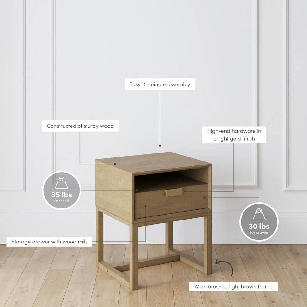 Luke is a farmhouse rustic end table that will perfectly complete your bedroom or living room. This nightstand features a wire-brushed light brown body and contrasting pale gold metal drawer handle that brings a touch of glam to any space. Luke is a functional bed side or sofa table thanks to its multiple storage areas. Choose what to display or what to hide with its pull-out drawer and open cubby and keep your bedroom clutter-free.Nathan James is the furniture company built for this generation. You don’t need to spend a fortune to get quality design-first furniture and when we say easy assembly, we mean it.Our guarantee is our word. Your purchase is backed by a 100% money-back guarantee. If you have any quality issues just contact us and we will send you a replacement immediately-no questions asked.Materials:- Wire-Brushed Light Brown Paper- Light Gold PC MetalAssembly Must-Haves:- Packaging carton as working surface- Phillips head screwdriverWeight Limit:- 85 lbs. shelf- 30 lbs. for the drawer