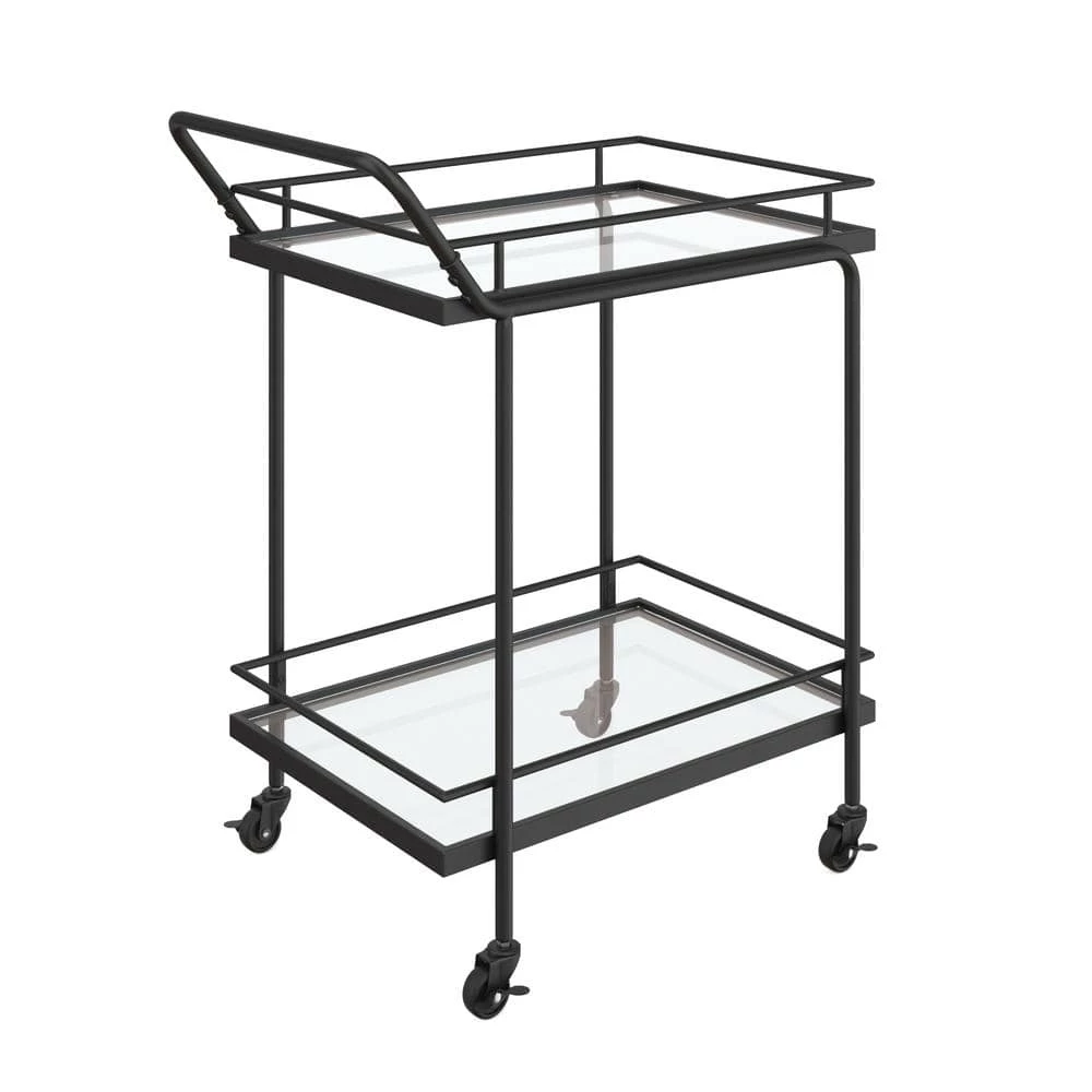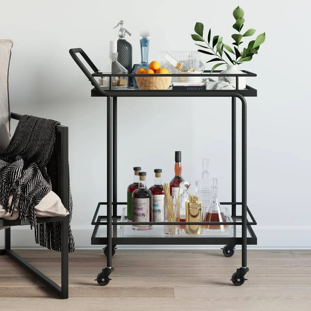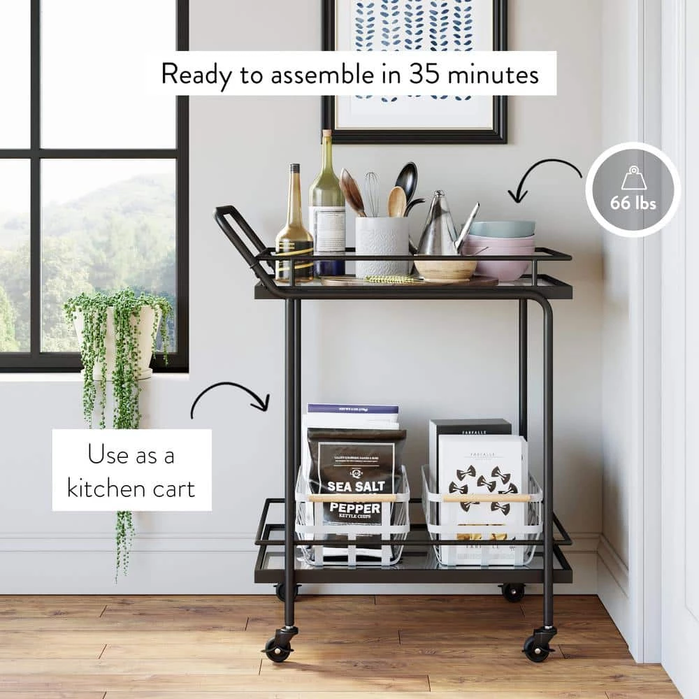 Nathan James is the furniture company built for this generation. You don’t need to spend a fortune to get quality design-first furniture and when we say in. easy assembly in. we mean it. Sally is a sleek rolling bar cart that features two glass shelves with a durable black metal frame that makes it easy to keep glassware, pitchers and food or drinks handy while serving. Lock it into place with its high-quality caster wheels for the dinner party or roll it outside to the patio for guests to enjoy a beverage while talking.