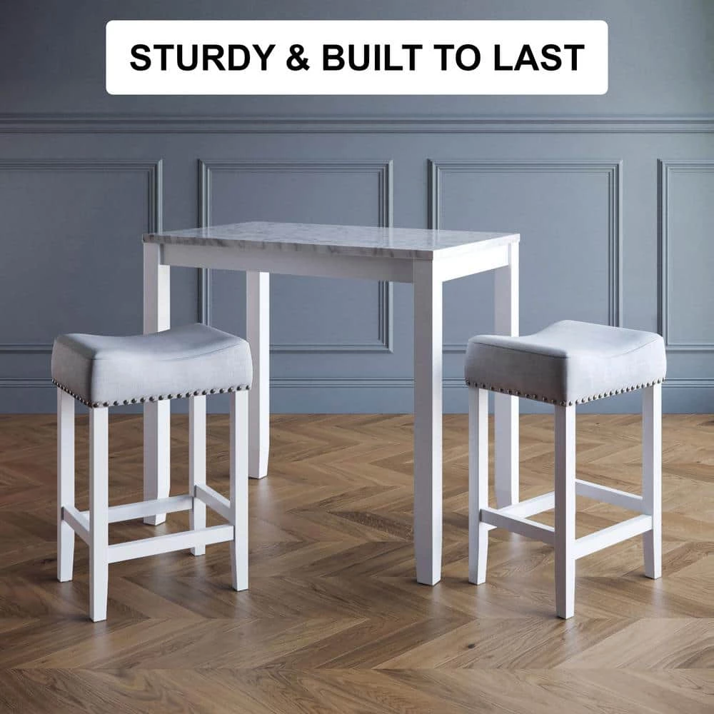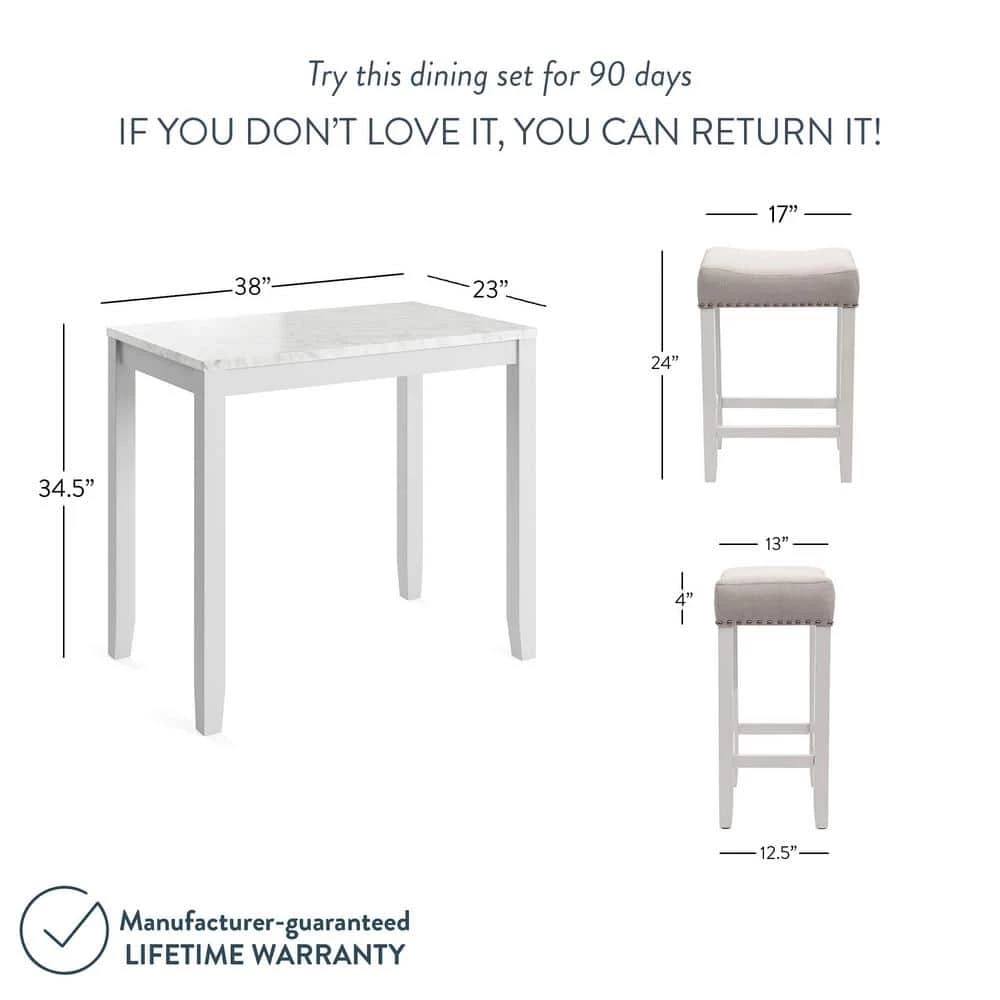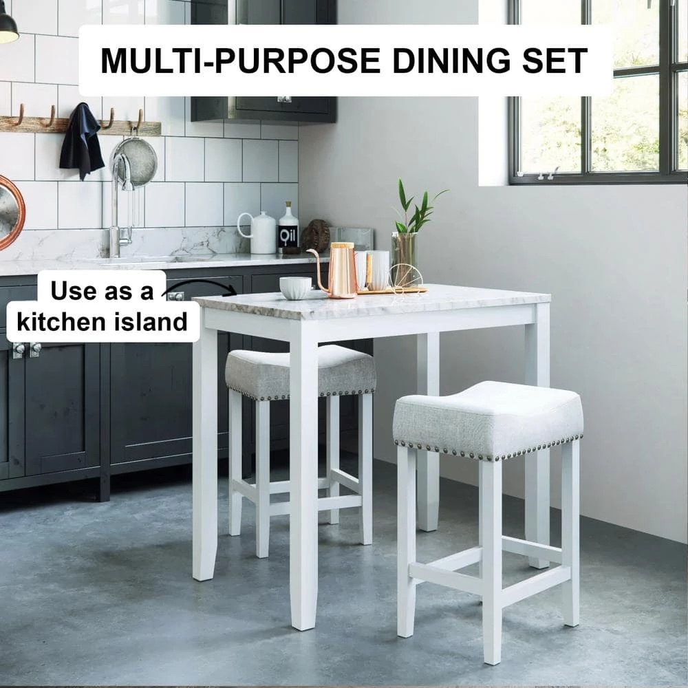 - Enjoy bistro dining with a marble-laminated table with 2-fabric stools