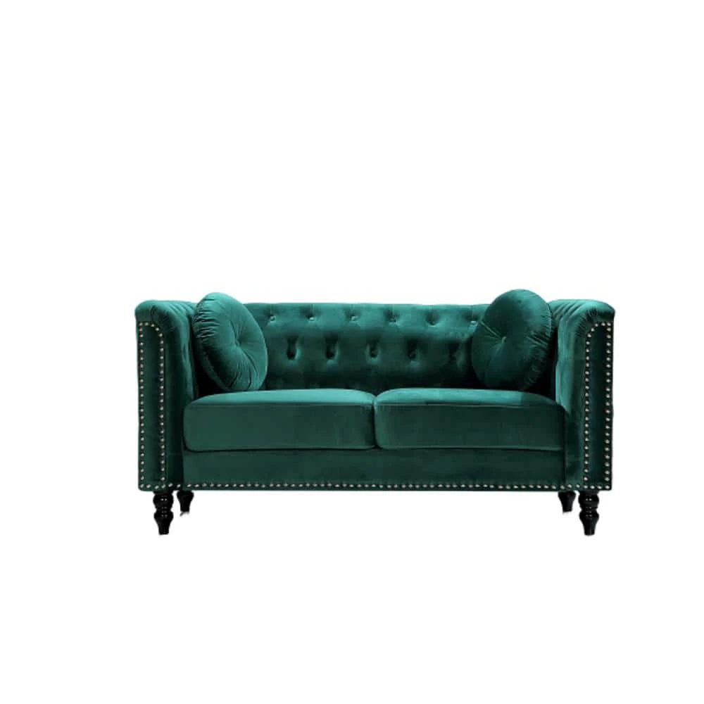 The perfect-Piece to reflect your regal tastes, this classic Kittleson Classic Nail head Chesterfield Sofa anchors your seating ensemble in timeless appeal. Crafted from the wood frame, this dapper design strikes an updated, clean-lined silhouette with tight arms and wood round tapered feet. Crushed velvet fabric upholstery brings out this sofa’s glamorous side, while exquisite details including high-density foam fill with spring support, matching bolster pillows, and a button-tufted backrest elevates the design with coordinating throw pillows. This stunning sofa with 2-accent pillows. boasts loose back cushions to showcase either details, Complete your living room decor with these chic seating options.