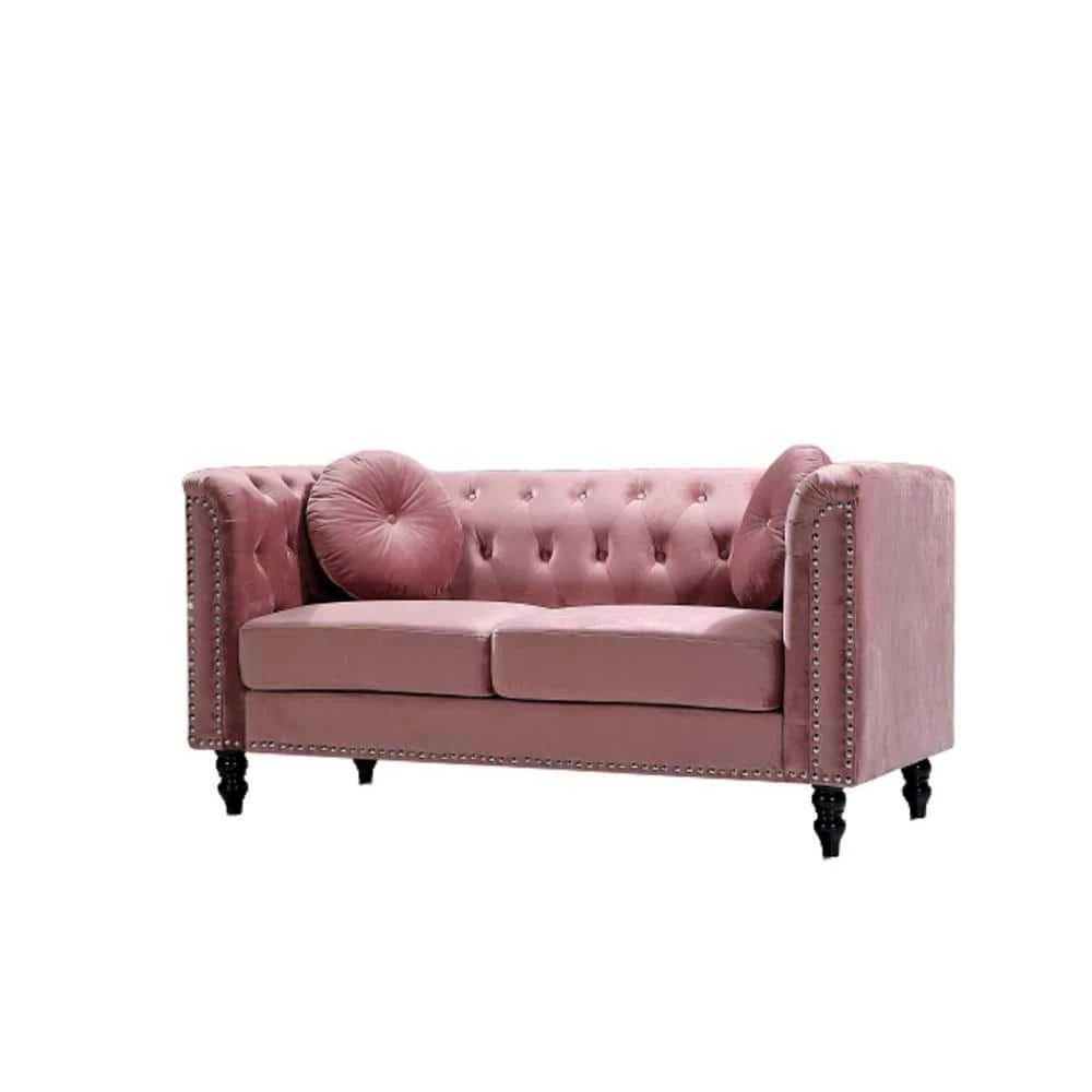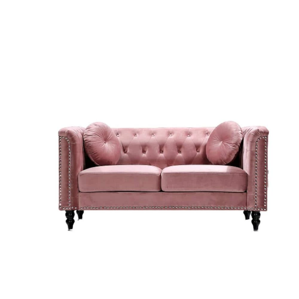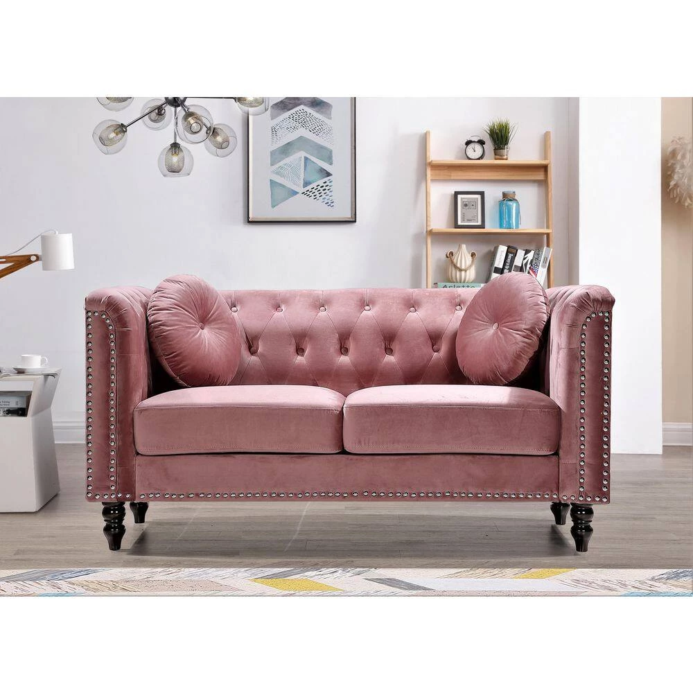 The perfect piece to reflect your regal tastes, this classic Kittleson Classic Nail head Chesterfield Sofa anchors your seating ensemble in timeless appeal. Crafted from the wood frame, this dapper design strikes an updated, clean-lined silhouette with tight arms and and wood round tapered feet. Crushed velvet fabric upholstery brings out this sofa’s glamorous side, while exquisite details including high-density foam fill with spring support, matching bolster pillows, and a button-tufted backrest elevates the design with coordinating throw pillows. This stunning sofa with two accent pillows. boasts loose back cushions to showcase either details, Complete your living room decor with these chic seating options.